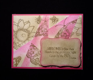 This is my retiform card using the tutorial in Mark's Finest Papers' April Blog Hop. I used a bright pink and a softer bamboo color to fill in the background, then stamped images from stamp sets Hello Butterflies and Bring On The Sun in a light brown. I made a tag using the same colors and popped it up. This was a fun technique and I liked how easy it was! Thanks for a great tutorial!!