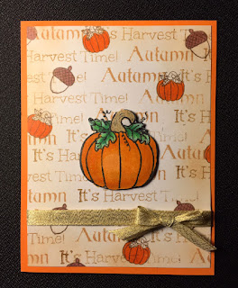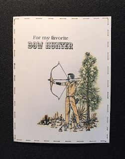 I recently earned this stamp set (Bow Hunting) from Mark's Finest Papers, and was so excited to use it for this challenge! In Wisconsin, fall means the start of hunting season for lots of people, and this bow hunting stamp was the perfect choice! I stamped the image in black ink and used a paint brush and ink to add fall colors to the image.......green, yellow, orange and a little brown. I stamped the sentiment from the same set in the top corner and used a brown pen to make an outline. I kept it very