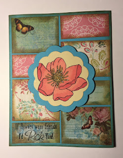 This was a very fun tutorial for me.....I picked 4 scraps that sort-of matched each other and started cutting. I edged them all in light tan and glued them down to my base color. I stamped a sentiment from Mark's Finest Papers in the left lower corner....it's from the Be Happy Mini set. I stamped a flower from Mark's Magnolia stamp set on an ivory piece of cardstock and colored it with Copic markers before mounting it on the same base color as the card. I popped it up with pop dots. I added just a touch of glitter to the center of the flower to finish it off. Thank you so much for stopping by...grab some of your own scraps and enter this fun challenge at Mark's Finest Papers. Have a wonderful day.