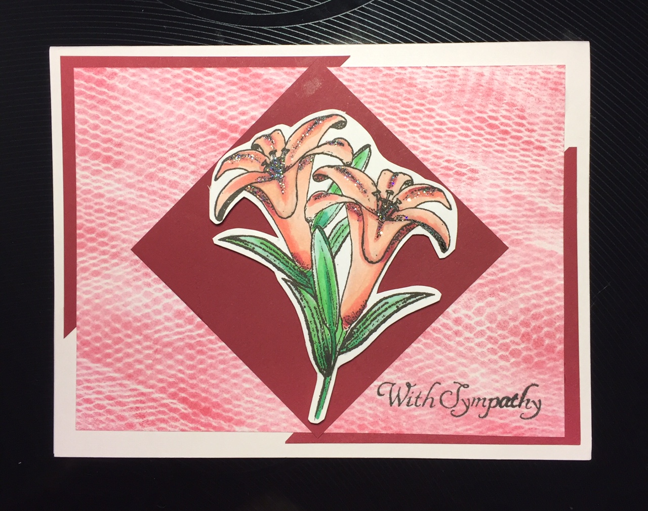 For this card I started with a pomegranate color, thinking I was going to do a fall card. But as it turned out, well.....you can see it's not really a fall card! I used the tutorial to make the background and layered it on two pomegranate colored triangles. I cut out a square of the same pomegranate cardstock, turned it and glued it in the middle of the card. I used a flower stamp from Mark's Finest Papers "Blessings" stamp sets, colored it with Copic markers and fussy cut it out. I layered this with pop dots on the square. I stamped "With Sympathy" in the corner and then added a little bit of glitter to the flower.....it's a little hard to see from this picture.