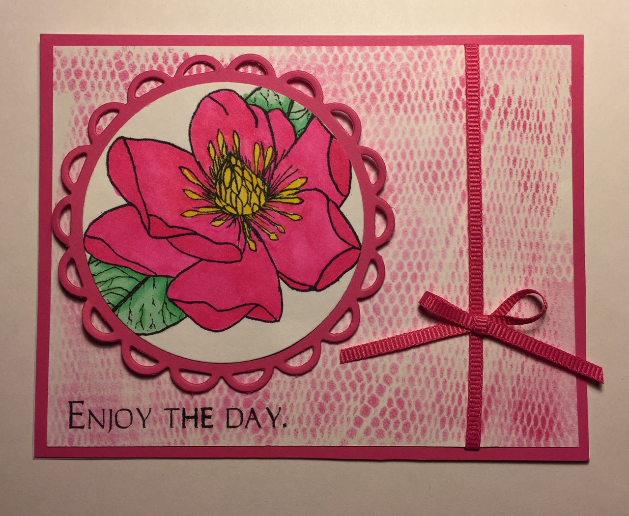 I'd seen this technique before but had never tried it, so this was a new one for me. I taped the mesh piece down over top of my white cardstock and used a sponge to ink up the white cardstock. Then I mounted this on a pink base and used a stamp from Mark's Finest Papers "Mothers Magnolia" stamp set for my focal point. I colored it with Copic markers before mounting it on a decorative circle cut out of the same pink as the base card. I popped this circle up with pop dots. I stamped a sentiment, also from the "Mother's Magnolia" stamp set underneath that and tied a ribbon around the white piece. I added a small bow to finish it off. Thank you for stopping by and have a wonderful day. Why not try this technique and join in the fun at Mark's Finest Papers challenge?