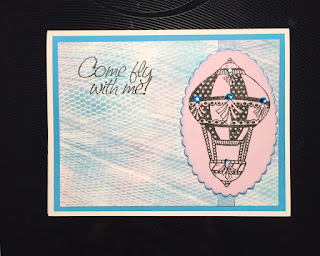 I made another background using this technique, this time experimenting with a couple of different colors. I used stamps from Mark's Finest Papers "Up Up & Away" stamp set. I cut out a decorative oval and stamped the balloon on that piece, which I then edged in the same blue as the cardstock. I placed a piece of ribbon underneath it and popped it up with pop dots and then stamped the sentiment in the left upper corner. For the finishing touch I added some colored rhinestones to the balloon.