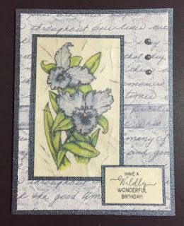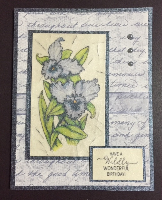 I used Copic markers to color my image, and then used a technique called "Cracked Glass". I inked my entire image with a VersaMark ink pad and heat embossed it with clear embossing powder. I did this 2 or 3 more times, making layers of clear embossing, and then put my image in the freezer for 5 minutes. When I took it out of the freezer, I started to bend it, and the layers of embossing cracked just a little. I continued to bend it until it had lots of little cracks all over. I took an ink pad of similar color to my background paper and dobbered ink over the entire image, making sure I got ink in the cracks. After wiping off the excess ink, I was left with an image that looked aged and distressed. For the sentiment, I heat embossed it with VersaMark ink and clear embossing powder just once.
