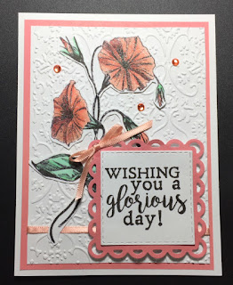 Welcome to PIP Challenge 1748, an "Anything Goes" Challenge sponsored this week by the wonderful MHK Designs. Please visit Mynn's website and browse her beautiful images. I am working this week with images from "Glory of the Lord" digital stamp set. I colored the flower with Copic markers and fussy cut it out. I mounted it on an embossed piece of white cardstock, then added a piece of peach ribbon from my stash and a few peach gem stones. I used my Sparkle Markers from Spectrum Noir to add some glitter to the flowers. Lastly, I mounted the sentiment on a scalloped square die cut and raised it with pop dots. Please visit our challenge blog to see the other design team members' beautiful cards and be sure to get your entry linked up for a chance to win a prize from our sponsor. Thanks so much for stopping by, and have a wonderful day!!